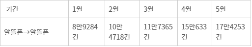 이동통신 3사에서 알뜰폰으로 옮긴 경우(11만7513명)보다 알뜰폰에서 알뜰폰으로 이동한 건수가 더 많았다. 알뜰폰 내 가입자 이동은 올 들어 꾸준히 증가세다. 2월 10만건을 돌파한 후 3월 11만7365건, 4월 15만633건, 5월에는 17만4253건까지 늘었다.