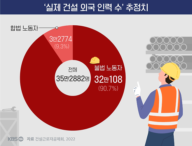 건설근로자공제회가 지난해 말 발간한 <건설근로자 수급실태 및 훈련수요 조사>에 따르면 지난해 '실제 외국인력'은 35만여 명이었는데 그 중 합법적으로 조달된 인력은 3만 2천여 명에 불과하고 나머지 32만여 명이 '불법 노동자'라고 추산했습니다. 무려 90.7%에 달하는 규모입니다. 그 전 해인 2021년(27만 9,022명·88.2%)보다도 늘었습니다.