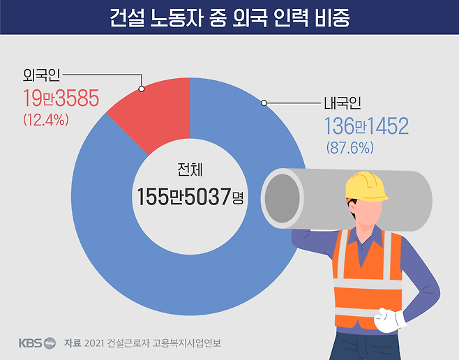건설근로자공제회가 지난해 발간한 <2021 건설근로자 고용복지사업연보>에 따르면 2021년 건설 노동자 155만여 명 중 외국 인력은 19만 3천여 명으로 전체의 12.4%로 나타났습니다. 과거 5년 치(2017~2021)를 봐도 외국 인력 비중은 12.3~13.8%로 큰 변동이 없었습니다.
