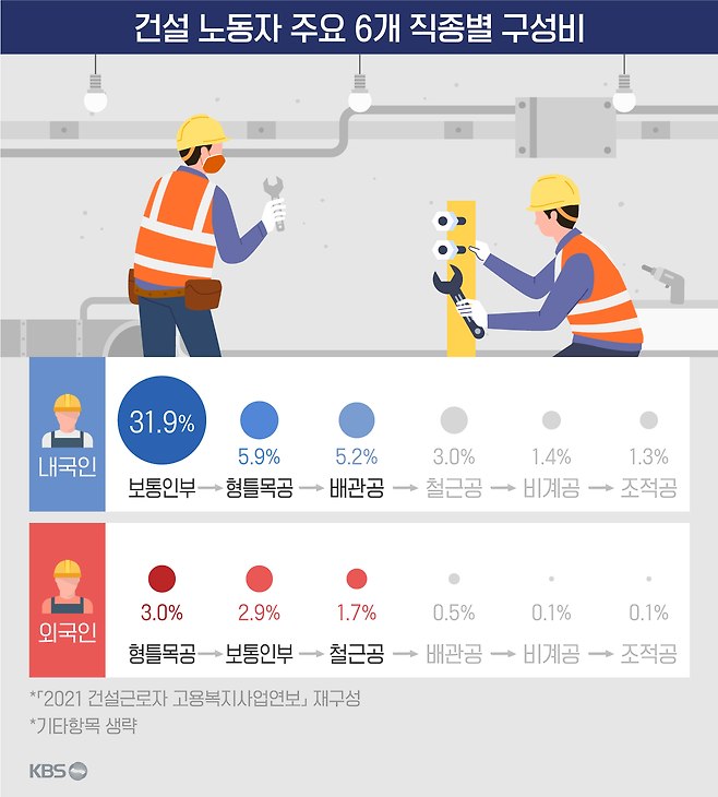 건설업 주요 6개 직종별 구성비로 따져보면 내국인이 단순 노무직인 '보통인부'에 주로 몰려있는 것과 달리 외국인은 형틀목공과 철근공 같은 건설업 핵심 분야에 고루 퍼져있습니다. 거푸집을 설치·해체하는 형틀목공과 철근을 다루는 철근공은 일의 특성상 체력이 많이 필요해 연령대가 상대적으로 높은 내국인이 기피하는 영역입니다.