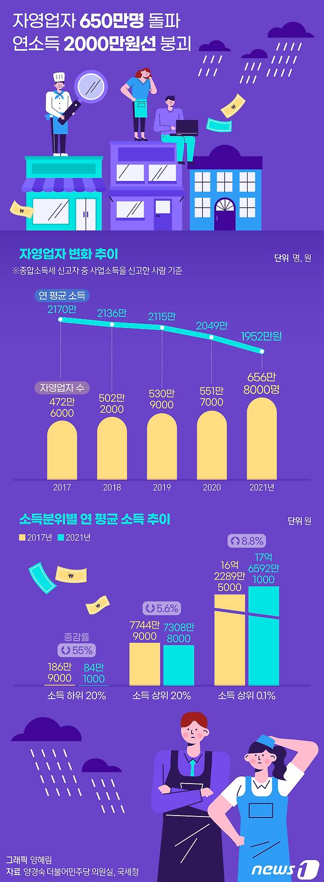 (서울=뉴스1) 양혜림 디자이너 = 최근 5년간 자영업자의 수가 184만명 늘었으나 평균 소득은 매년 줄어든 것으로 나타났다.