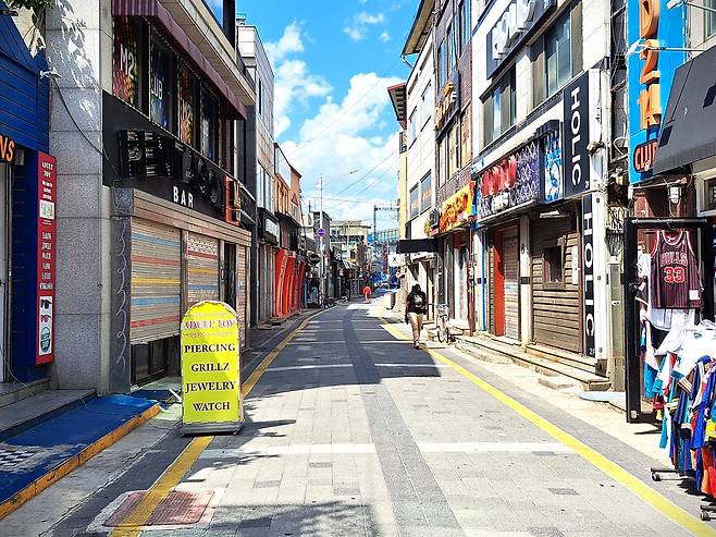 | ▲ 주 도로 보산동 외국인 관광특구 주 도로 중 한구간. 영어 일색 간판이 즐비하다. |