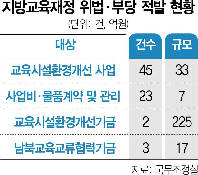 국조실이 지난해 10월부터 지난달까지 조사한 결과로 교육시설환경개선 사업에서 총 45건(33억 원)이 과다 집행된 것으로 나타났다.
