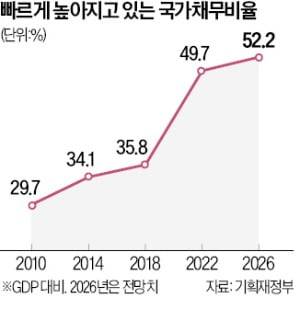 한국의 재정 위험이 갈수록 악화하는 이유는 저출산·고령화에 따른 인구구조 변화로 보건과 연금 등 재정지출 증가 속도가 빨라지는 데 비해 경제는 저성장 국면으로 접어들기 때문이다. 한국의 GDP 대비 국가채무비율은 2010년 29.7%에서 2018년 35.8%로 느린 속도로 오르다가 지난해 49.7%로 크게 높아졌다. 기재부는 이대로라면 2026년에는 52.2%로 50%를 넘어설 것으로 전망하고 있다. 고령화로 복지 지출이 빠르게 증가하는 가운데 코로나19 사태 대응을 이유로 문재인 정부가 대대적인 확장 재정 정책을 펼친 영향이다.