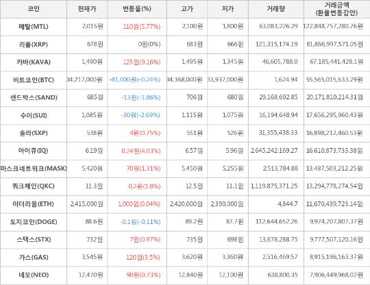 또한, 메탈(5.77%, 2,015원), 아이큐(4.03%, 6.19원), 가스(3.5%, 3,545원), 쿼크체인(1.8%, 11.3원), 마스크네트워크(1.31%, 5,420원), 스택스(0.97%, 732원), 솔라(0.75%, 538원), 네오(0.73%, 12,470원), 이더리움(0.04%, 2,415,000원)이 상승세를 나타냈다.