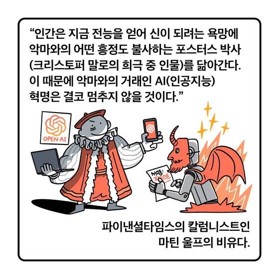 “인간은 지금 전능을 얻어 신이 되려는 욕망에 악마와의 어떤 흥정도 불사하는 포스터스 박사(크리스토퍼 말로의 희극 중 인물)를 닮아간다. 인간은 포스터스 박사다. 동시에 악마인 메피스토펠레스이다. 이 때문에 악마와의 거래인 AI(인공지능) 혁명은 결코 멈추지 않을 것이다.” 파이낸셜타임스의 칼럼니스트인 마틴 울프의 비유다.