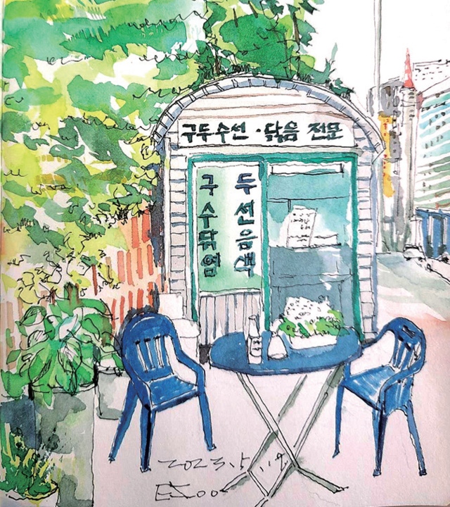 그래도 45년 청춘을 건 생업을 내려놓기를 사장님은 무척 아쉬워하신다. 고향 친구는 창피해 못 만났지만 이곳에서 희로애락을 나누던 친구들은 잊을 수 없단다. 초창기엔 직원을 두 명이나 고용했다고 하는데 멀리 부산과 서울에서도 구두 참 예쁘게 닦았다고 지나는 길에 다시 들르는 단골들이 눈에 맺힌다고. 정겨운 사람들과 함께한 세월에 가치를 둔 사장님의 목소리가 채워질 수 없는 공허처럼 허전하다. -이 멋진 공간을 오늘은 수강생 한이수씨가 그렸다. 그녀의 필력이 초록빛 여름처럼 점점 짙게 번진다.