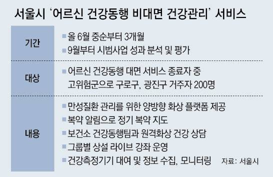 그런데 한정된 기간 진행하는 방문 진료만으론 고령층의 만성질환을 꾸준히 관리하기 어렵다는 지적이 꾸준히 제기됐다. 특히 신종 코로나바이러스 감염증(코로나19) 확산 이후 방문진료가 어려워지면서 재난 위기에서도 지속할 수 있는 건강관리 체계를 구축해야 한다는 지적이 나왔다. 이에 서울시는 건강동행사업을 △정보통신기술(ICT) 원격 화상 모니터링 △생방송 건강 강좌 등으로 확대하는 시범사업을 이달 중순부터 진행하기로 했다.