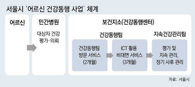 서울시는 2018년부터 만성질환이 둘 이상 있는 65세 이상 홀몸 어르신 등의 건강을 관리하는 ‘어르신 건강동행사업’을 진행 중이다. 서울시가 동네 의원을 통해 건강 관리가 필요한 어르신을 선별하면 의사와 간호사, 영양사, 물리치료사 등으로 구성된 15개 자치구 ‘건강동행팀’이 방문해 2개월 동안 건강을 점검하고 상담하는 방식이다.