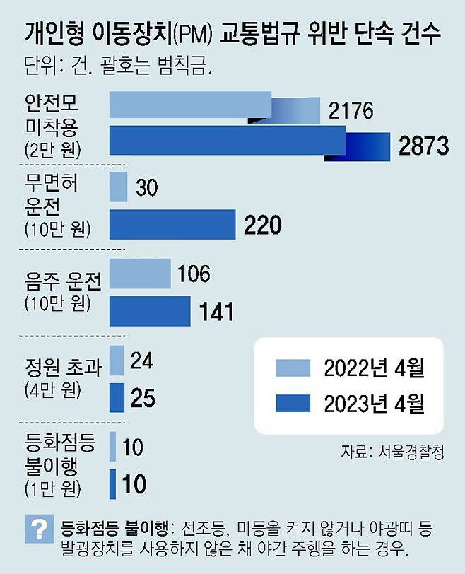 시가 규제 강화에 나선 것은 최근 교통법규를 위반하는 PM 운전자가 급증하고 있어서다. 서울경찰청에 따르면 올 4월 한 달간 PM의 교통법규 위반 3269건이 단속됐는데, 이는 지난해 같은 달(2346건)보다 약 40% 증가한 것이다. 특히 올 4월 단속된 무면허 운전(220건)의 경우 지난해 4월(30건)의 7배 이상으로 급증했다.