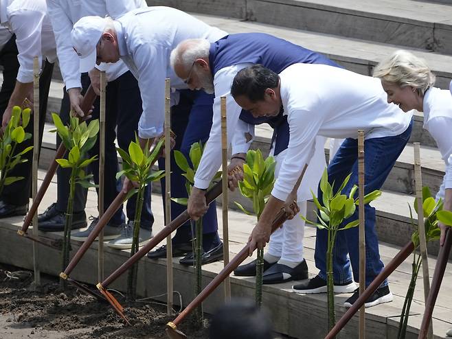 | ▲ 2022년 11월 16일(현지시간) 주요 20개국(G20) 정상회의에 참가한 각국 대표들이 인도네시아 발리 덴파사르의 맹그로브 파종구역에서 삽질을 하고 있다. 사진 왼쪽부터 조 바이든 미국 대통령, 나렌드라 모디 인도 총리, 조코 위도도 인도네시아 대통령, 우르줄라 폰데어라이엔 유럽연합(EU) 집행위원장. |