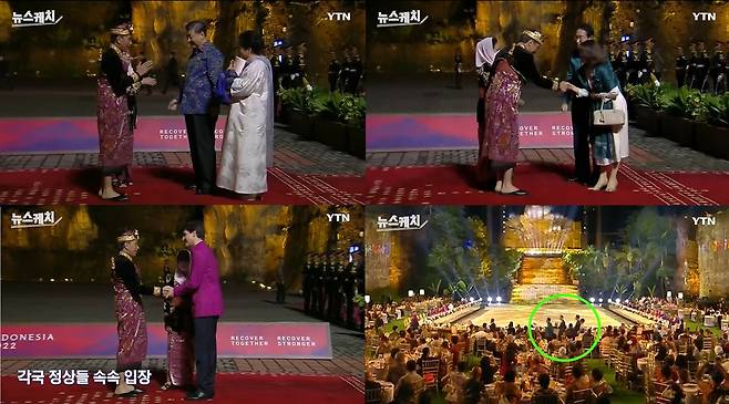 | ▲ 인도네시아에서 열린 G20 정상회의가 열렸던 2022년 11월 15일. 인도네시아 대통령이 각국 정상을 맞이하는 모습과 윤대통령 부부가 뒤늦게 행사 중에 자리를 찾아 가는 모습 |