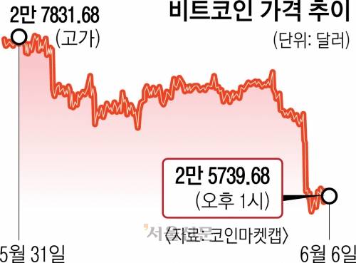 비트코인 가격이 2만 5000달러대로 내려온 건 지난 3월 17일 이후 3개월 만이다. 지난해 말 FTX 파산 사태 등으로 1만 5000달러대까지 떨어졌던 비트코인은 올해 4월 미국 은행발 위기가 확산하자 ‘대체 자산’으로 주목받으면서 급등해 3만 달러를 돌파하기도 했다. 최근엔 오는 13~14일(현지시간) 열리는 6월 연방공개시장위원회(FOMC)의 추가 금리인상 여부를 관망하며 2만 달러대 후반에 머물렀다.