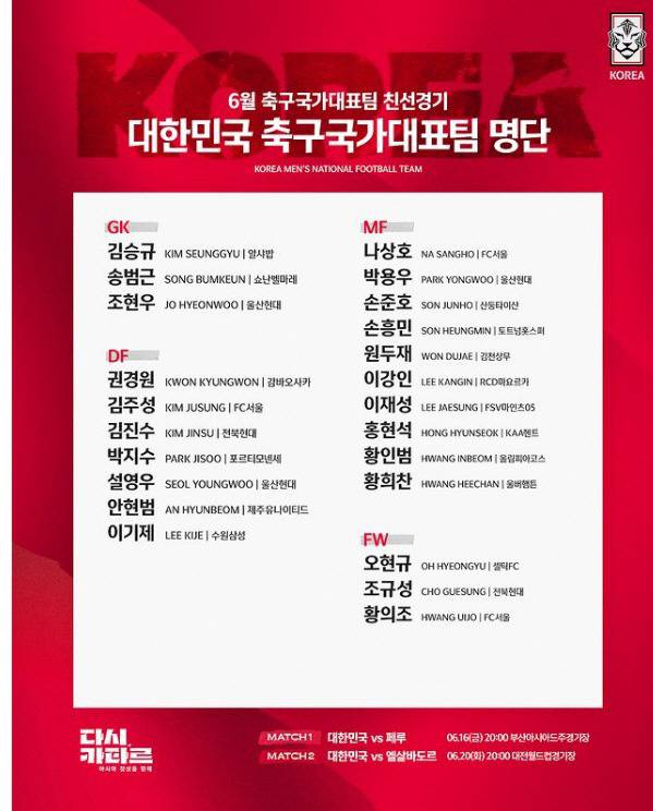 ▶FW(3명)=황의조(서울) 조규성(전북) 오현규(셀틱)