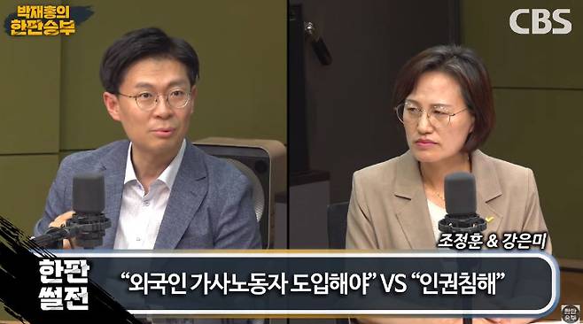 ◇ 박재홍> 오늘 외국인 가사도우미 도입 문제 찬반 토론 해 봤는데요. 시간이 굉장히 짧고 문제가 중요한 문제이기 때문에 또 이 자리 마련하면 좋겠습니다. 함께해 주신 분 정의당 강은미 의원님, 시대전환 조정훈 의원님 두 분 고맙습니다.