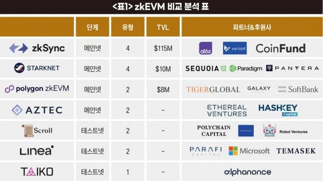 한편 zkEVM 기술의 발전 역시 주목할 만하다. 원래 zk 롤업과 이더리움 가상 머신(EVM : Ethereum Virtual Machine)은 호환되지 않았지만 zkEVM 기술 덕분에 호환성이 높아졌다. zkEVM은 다양한 솔루션이 있는데 레이어 2 생태계는 저마다 다른 솔루션을 채택하고 있는 양상이다. <표1>은 글로벌 가상자산 투자사 알파논스 트위터 계정 분석을 인용한 zkEVM 비교 분석한 것이다.