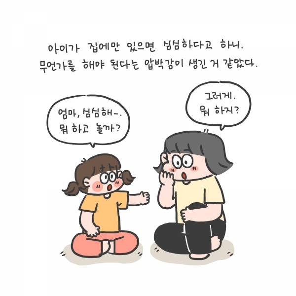 아이가 집에만 있으면 심심하다고 하니, 무언가를 해야 된다는 압박감이 생긴 거 같았다.