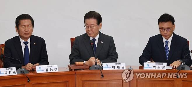 (서울=연합뉴스) 한상균 기자 = 민주당 이재명 대표가 7일 국회에서 열린 당 최고위에 참석하고 있다. 왼쪽부터 정청래 최고위원, 이 대표, 박광온 원내대표. 2023.6.7