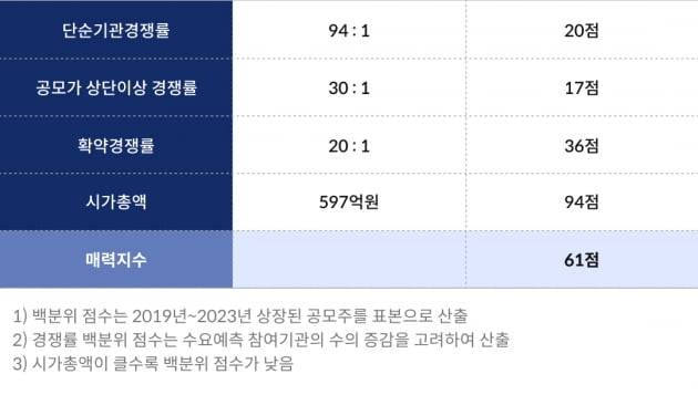 투자 매력 지수는 61점으로 앞서 상장한 공모기업 중 라이프시맨틱스(수익률 40%), 바이젠셀(13%), 바이오인프라(40%), 엘비인베스트먼트(66%), 큐라클(23%) 등과 비슷했다.