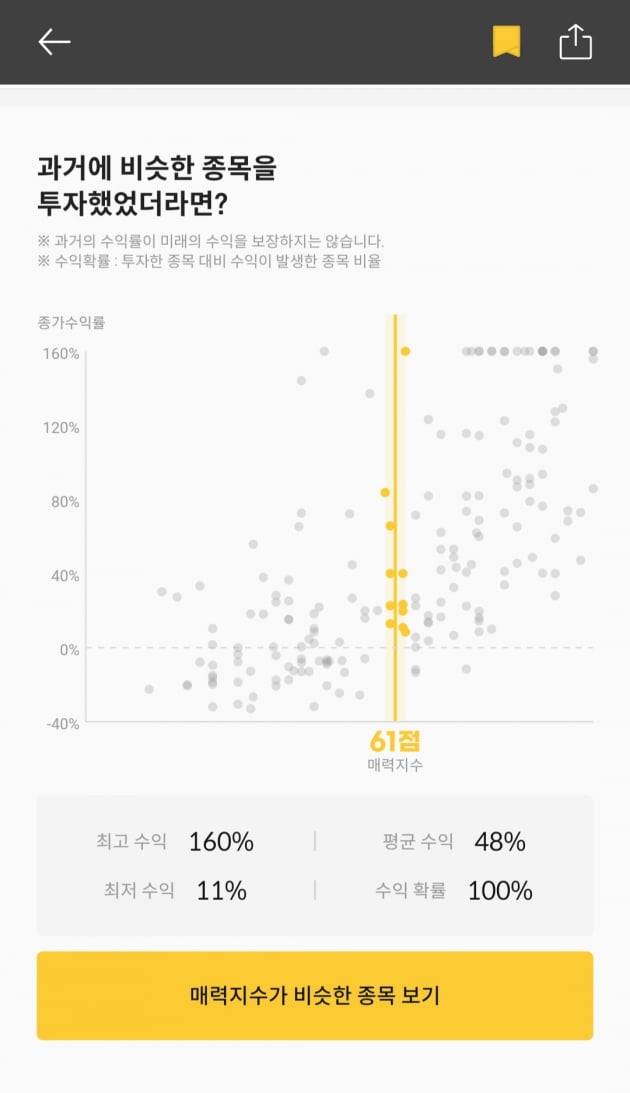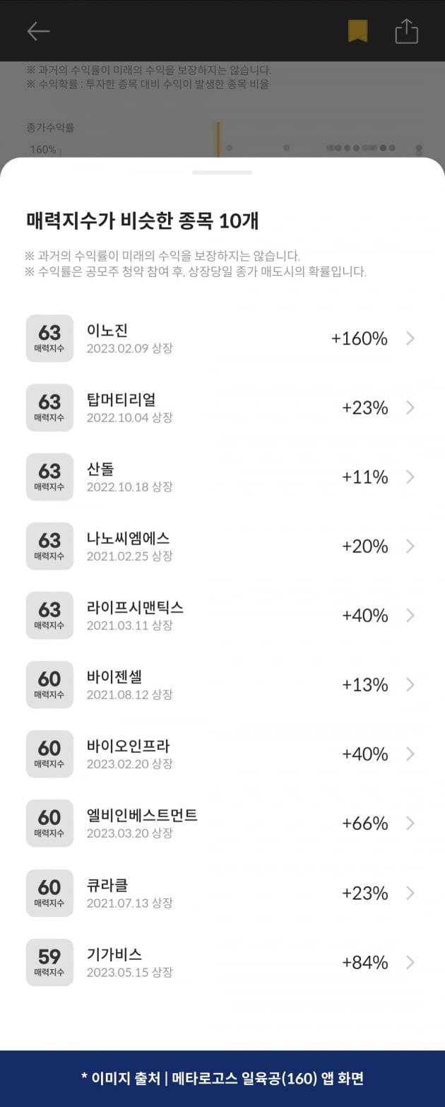 투자 매력 지수는 61점으로 앞서 상장한 공모기업 중 라이프시맨틱스(수익률 40%), 바이젠셀(13%), 바이오인프라(40%), 엘비인베스트먼트(66%), 큐라클(23%) 등과 비슷했다. 이들의 수익확률은 100%, 평균 수익은 48%였다. 최고 수익은 160%, 최저수익은 11%로 나타났다.