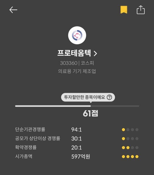 [마켓PRO]청약할까말까 : 프로테옴텍, 수익확률 100%, 투자매력지수 61점