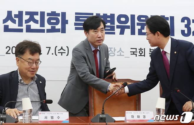 (서울=뉴스1) 송원영 기자 = 하태경 국민의힘 시민단체 선진화 특위 위원장이 7일 오전 서울 여의도 국회에서 열린 시민단체 선진화 특위 제3차 회의에서 류성걸 의원과 인사를 나누고 있다. 2023.6.7/뉴스1