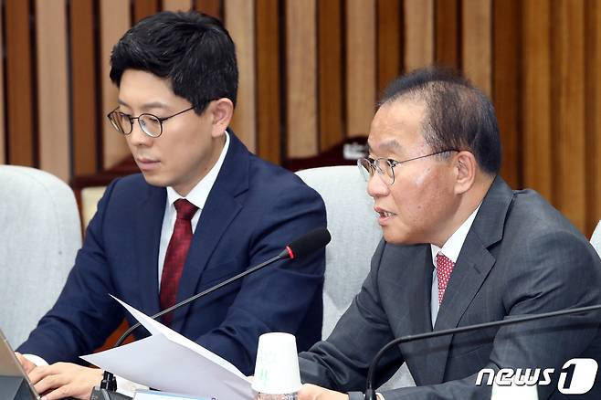 (서울=뉴스1) 황기선 기자 = 윤재옥 국민의힘 원내대표가 7일 오전 서울 여의도 국회에서 열린 임명장 수여식 및 확대당직자회의에서 모두발언을 하고 있다. 2023.6.7/뉴스1