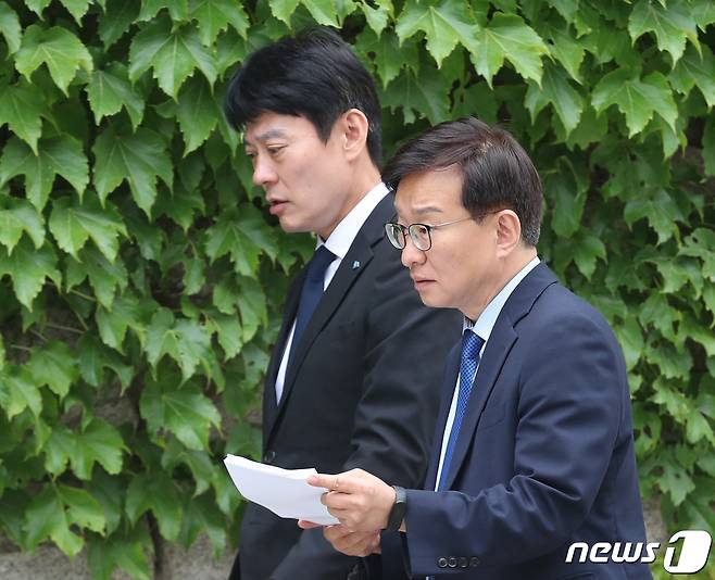 (서울=뉴스1) 송원영 기자 = 더불어민주당 권칠승 수석대변인과 한민수 대변인이 7일 오전 서울 여의도 국회 본관에서 나오고 있다. 2023.6.7/뉴스1