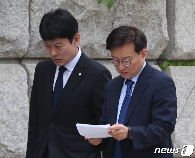 (서울=뉴스1) 송원영 기자 = 더불어민주당 권칠승 수석대변인과 한민수 대변인이 7일 오전 서울 여의도 국회 본관에서 나오고 있다. 2023.6.7/뉴스1
