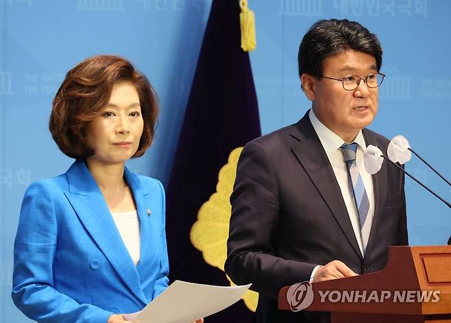 (서울=연합뉴스) 이정훈 기자 = 더불어민주당 '김기현 의원 땅 투기 및 토착·토건비리 의혹 진상조사 태스크포스(TF) 황운하 단장이 7일 오전 국회 소통관에서 기자회견을 열고 국민의힘 김기현 대표의 불법 쪼개기 후원금 모금 의혹을 제기하고 있다. 왼쪽은 양이원영 의원. 2023.6.7
