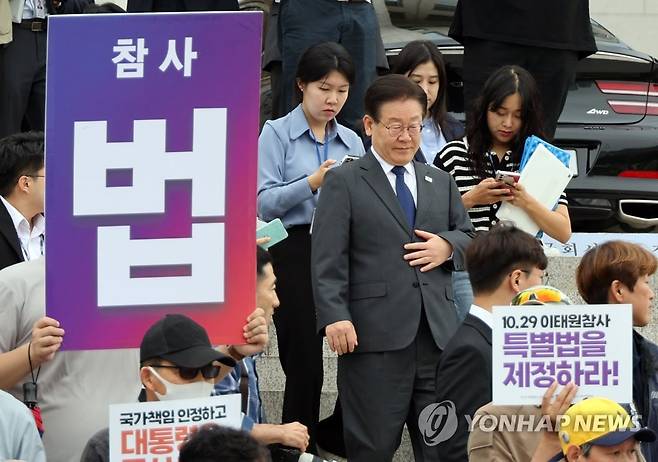 (서울=연합뉴스) 한상균 기자 = 민주당 이재명 대표가 7일 국회 앞에서 열린 이태원참사 진상규명 특별법 제정 촉구 유가족 농성 시작 기자회견에 참석하고 있다. 2023.6.7