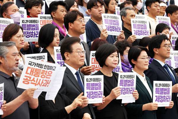 7일 국회 본청 계단앞에서 열린 이태원참사 진상규명 특별법 제정촉구 유가족 농성시작 기자회견에서 이재명 더불어민주당 대표가 발언을 하고 있다.