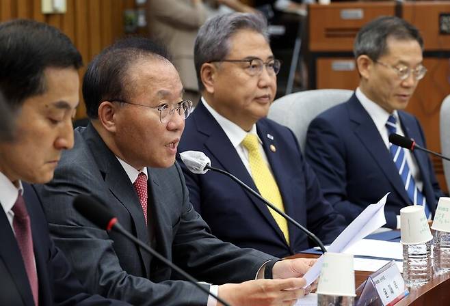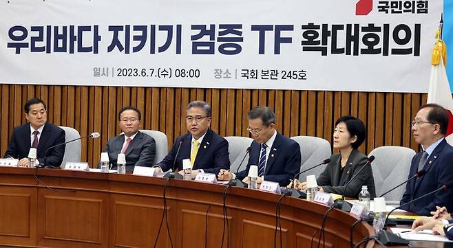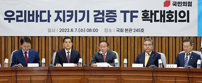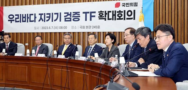 윤재옥 국민의힘 원내대표가 7일 오전 서울 여의도 국회에서 열린 우리바다 지키기 검증 TF 확대회의에서 발언을 하고 있다.