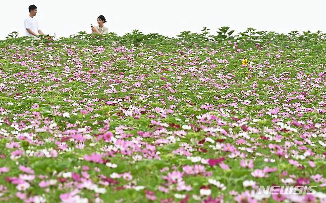 [안성=뉴시스] 김종택 기자 = 초여름 날씨를 보인 7일 경기도 안성시 안성팜랜드를 찾은 시민들이 활짝 핀 코스모스를 바라보며 추억을 남기고 있다. 2023.06.07. jtk@newsis.com