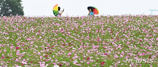 [안성=뉴시스] 김종택 기자 = 초여름 날씨를 보인 7일 경기도 안성시 안성팜랜드를 찾은 시민들이 활짝 핀 코스모스를 바라보며 추억을 남기고 있다. 2023.06.07. jtk@newsis.com