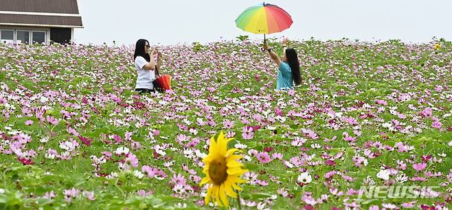 [안성=뉴시스] 김종택 기자 = 초여름 날씨를 보인 7일 경기도 안성시 안성팜랜드를 찾은 시민들이 활짝 핀 코스모스를 바라보며 추억을 남기고 있다. 2023.06.07. jtk@newsis.com