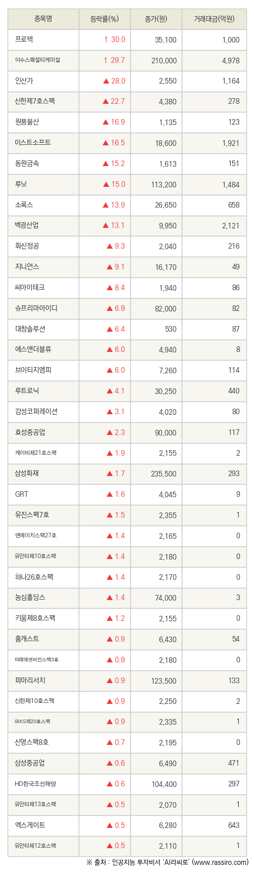 특히 프로텍은 전 거래일 대비 30.0% 오른 35,100원에 거래를 마감하여 높은 관심을 받았다.