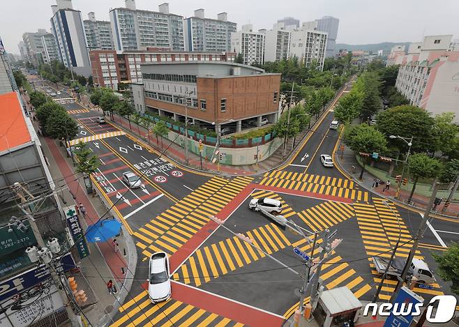 오는 7월부터 시행하는 도로교통법 시행규칙 개정안에 따라 전국 1만6000여 개 스쿨존에 ‘노란색 횡단보도’를 단계적으로 확대 도입하며 스쿨존의 기점(시작점)과 종점(끝나는 점)을 알리는 ‘어린이보호구역 기·종점 표시’ 작업도 함께 이뤄질 예정이다. 2023.6.7/뉴스1