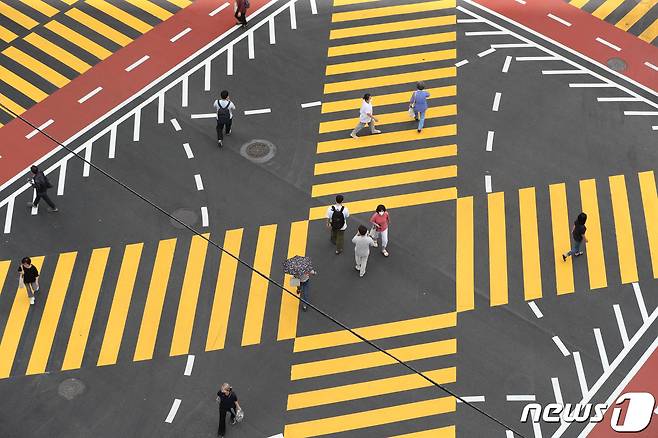 (용인=뉴스1) 김영운 기자 = 7일 오후 경기 용인시 기흥구 구갈초등학교 인근 어린이보호구역(스쿨존)에 설치된 노란색 횡단보도 위로 시민들이 지나가고 있다.