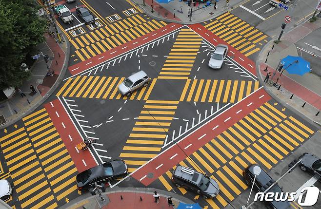 오는 7월부터 시행하는 도로교통법 시행규칙 개정안에 따라 전국 1만6000여 개 스쿨존에 ‘노란색 횡단보도’를 단계적으로 확대 도입하며 스쿨존의 기점(시작점)과 종점(끝나는 점)을 알리는 ‘어린이보호구역 기·종점 표시’ 작업도 함께 이뤄질 예정이다. 2023.6.7/뉴스1