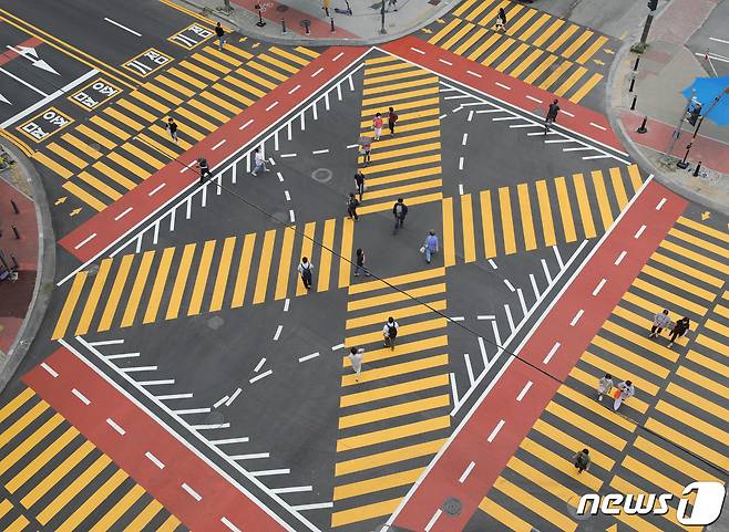(용인=뉴스1) 김영운 기자 = 7일 오후 경기 용인시 기흥구 구갈초등학교 인근 어린이보호구역(스쿨존)에 설치된 노란색 횡단보도 위로 시민들이 지나가고 있다.