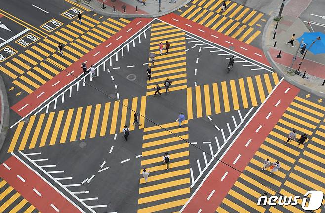 (용인=뉴스1) 김영운 기자 = 7일 오후 경기 용인시 기흥구 구갈초등학교 인근 어린이보호구역(스쿨존)에 설치된 노란색 횡단보도 위로 시민들이 지나가고 있다.