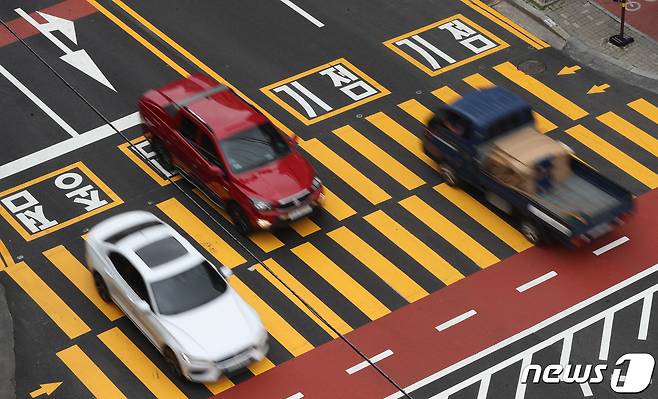 오는 7월부터 시행하는 도로교통법 시행규칙 개정안에 따라 전국 1만6000여 개 스쿨존에 ‘노란색 횡단보도’를 단계적으로 확대 도입하며 스쿨존의 기점(시작점)과 종점(끝나는 점)을 알리는 ‘어린이보호구역 기·종점 표시’ 작업도 함께 이뤄질 예정이다. 2023.6.7/뉴스1