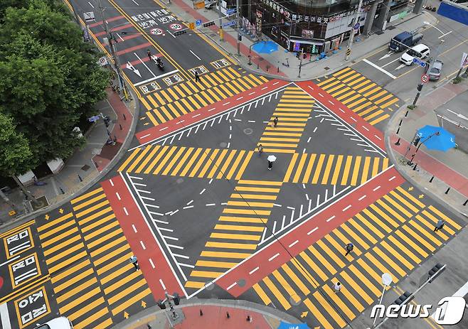 오는 7월부터 시행하는 도로교통법 시행규칙 개정안에 따라 전국 1만6000여 개 스쿨존에 ‘노란색 횡단보도’를 단계적으로 확대 도입하며 스쿨존의 기점(시작점)과 종점(끝나는 점)을 알리는 ‘어린이보호구역 기·종점 표시’ 작업도 함께 이뤄질 예정이다. 2023.6.7/뉴스1