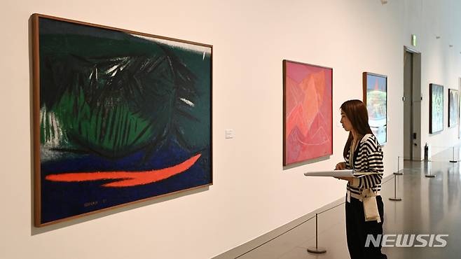 [안산=뉴시스] 김종택 기자 = 이건희컬렉션 한국 근현대미술 특별전 '사계'를 하루 앞둔 7일 경기도 안산시 경기도미술관에서 관계자가 전시된 작품을 살펴보고 있다. 이번 전시에서는 이건희컬렉션에 들어있는 작가의 대표작들을 살펴볼 수 있으며 국립현대미술관에 기증된 이건희컬렉션 46점을 중심으로 1927~2010년 작품 90점을 전시한다. 전시는 무료이며 오는 8일부터 8월20일까지 열린다. 2023.06.07. jtk@newsis.com