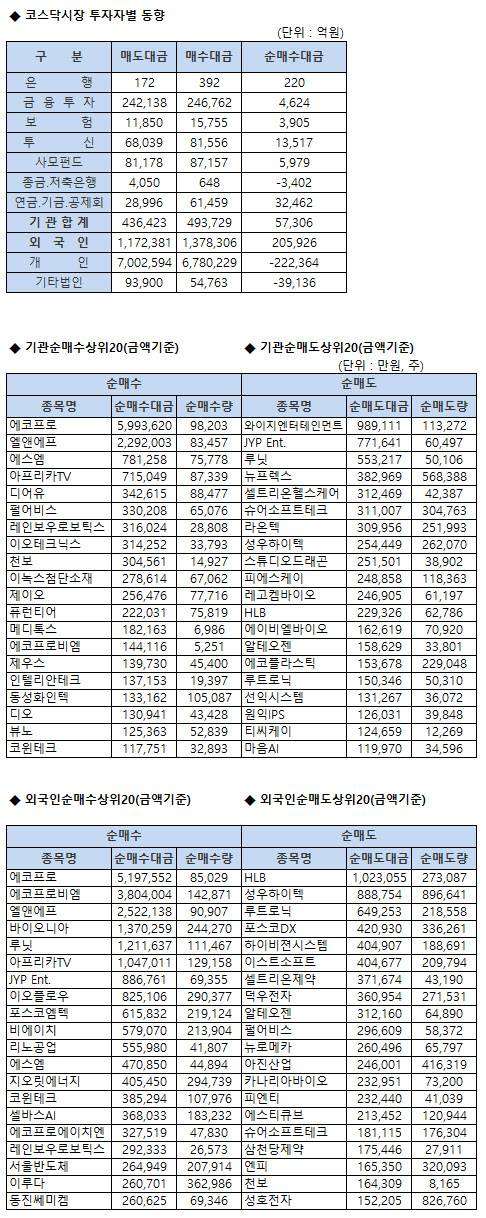 [표]코스닥 기관/외국인 매매동향(6/7 3시30분)