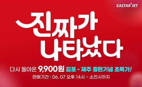 이번 프로모션은 탑승기간 6월8일부터 10월28일까지 김포-제주 노선 항공편을 대상으로 한다. 홈페이지와 모바일 앱, 웹을 통해 유류할증료와 공항이용료, 무료 수하물 15kg을 포함한 운임총액 9900원 초특가 운임부터 판매한다.
