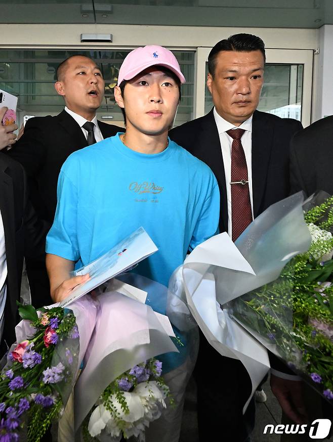 팬들이 준 꽃다발 들고 입국하는 이강인