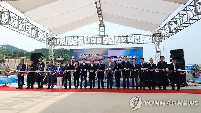(울산=연합뉴스) 장지현 기자 = 7일 오후 울산 동구 방어진수질개선사업소에서 개최된 방어진하수처리시설 증설사업 준공식에서 참가자들이 테이프 커팅을 하고 있다. 2023.6.7.