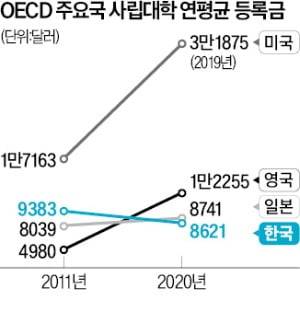 경제협력개발기구(OECD) 주요국과 비교해도 대학 등록금 인상률은 낮은 편이다. 대교협에 따르면 미국 영국 캐나다 프랑스 이탈리아 일본 등 주요 국가의 2020년 등록금은 2011년 대비 모두 인상됐다. 한국만 국공립대와 사립대 각각 581달러, 762달러 인하된 것으로 나타났다.